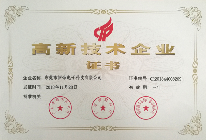 近日,經(jīng)國(guó)家科技部、財(cái)政部、國(guó)家稅務(wù)總局專家評(píng)審,東莞市恒帝電子科技有限公司獲得了由廣東省科技廳、財(cái)政廳、省國(guó)稅局、省地稅局聯(lián)合頒發(fā)的《高新技術(shù)企業(yè)》證書(shū),這標(biāo)志著我司成為國(guó)家高新技術(shù)企業(yè)的一員。